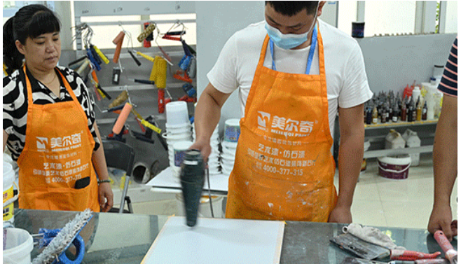 漆匠師傅通過勤奮學(xué)習(xí),不僅提升了仿石漆與藝術(shù)漆的施工工藝也了解到美爾奇仿石漆與