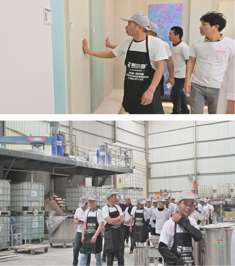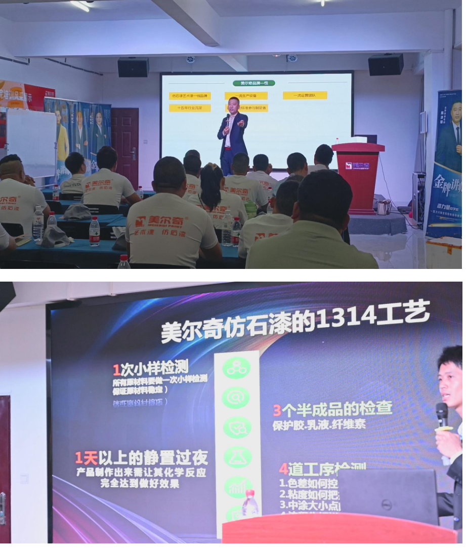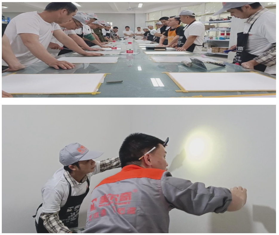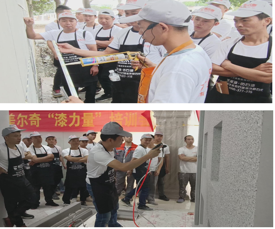 除了經(jīng)銷商門店突圍的思維點撥,工匠的實操培訓,也是此次漆力量商學院培訓的一大亮點。區(qū)別于以往單項的實操培訓,此次工匠培訓以提升綜合技能為目的,開設了圍繞外墻EPS構件安裝、新工藝教學、仿石漆新品實操以及圍繞內(nèi)墻多款藝術漆主流產(chǎn)品實操教學,真正做到將外墻一體化以及內(nèi)墻一體化相結合的模式,大大提升了工匠的綜合技能,打破了工匠以往技能單一的局面。此次工匠培訓采用縮小版別墅實體為單位分組,各小組負責整棟別墅的內(nèi)外墻施工。在3天的培訓時間內(nèi),通過工匠的巧手將毛坯的別墅實體演變成了一棟棟讓人嘆為觀止的精品。值得一提的是,此次藝術漆實操還加入了多款公司最新開發(fā)的藝術漆新品,其中微貝石和紫云煙這兩款產(chǎn)品,深受此次參訓工匠的青睞,不僅成品效果突出,適用于大多數(shù)生活場景,而且在施工便利性方面,更是深受工匠們的喜愛。